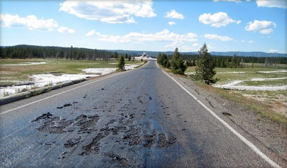 Naturalmente as características térmicas muitas vezes danificam estradas e calçadões de Yellowston, cozinhando buracos em estradas de asfalto e estacionamentos - marcada por cones de trânsito - são curiosidades bastante comuns.